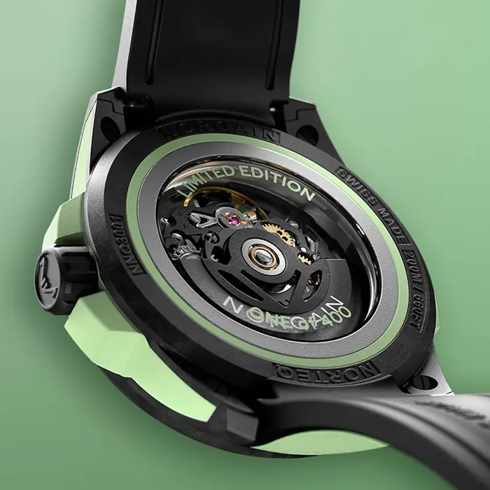 本モデルは400本限定生産の特別モデル。ムーブメントには、ブラックルテニウム仕上げのNB08SBlackを採用し、シックで洗練された印象を与えます。スケルトン仕様のこの自動巻きムーブメントは、COSC認定クロノメーターを受けており、41時間のパワーリザーブを保ちます。また、時針と分針には、高性能なX1 Super-LumiNova®を採用し、各モデルの鮮やかなデザインに合わせたカラーが特徴の一つです。